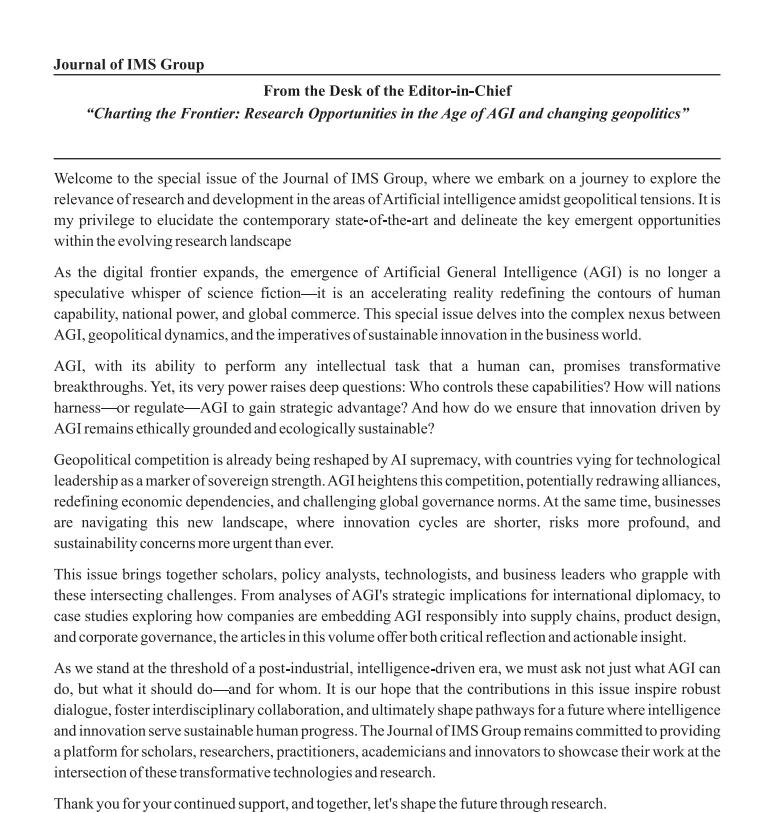• From the Desk of the Editor-in-C From the Desk of the Editor-in-Chief Charting the Frontier: Research Opportunities in the Age of AGI and changing geopolitics & Editorial: Navigating Innovation Through Research – IMS Journal, Vol. 22, Issue 1
